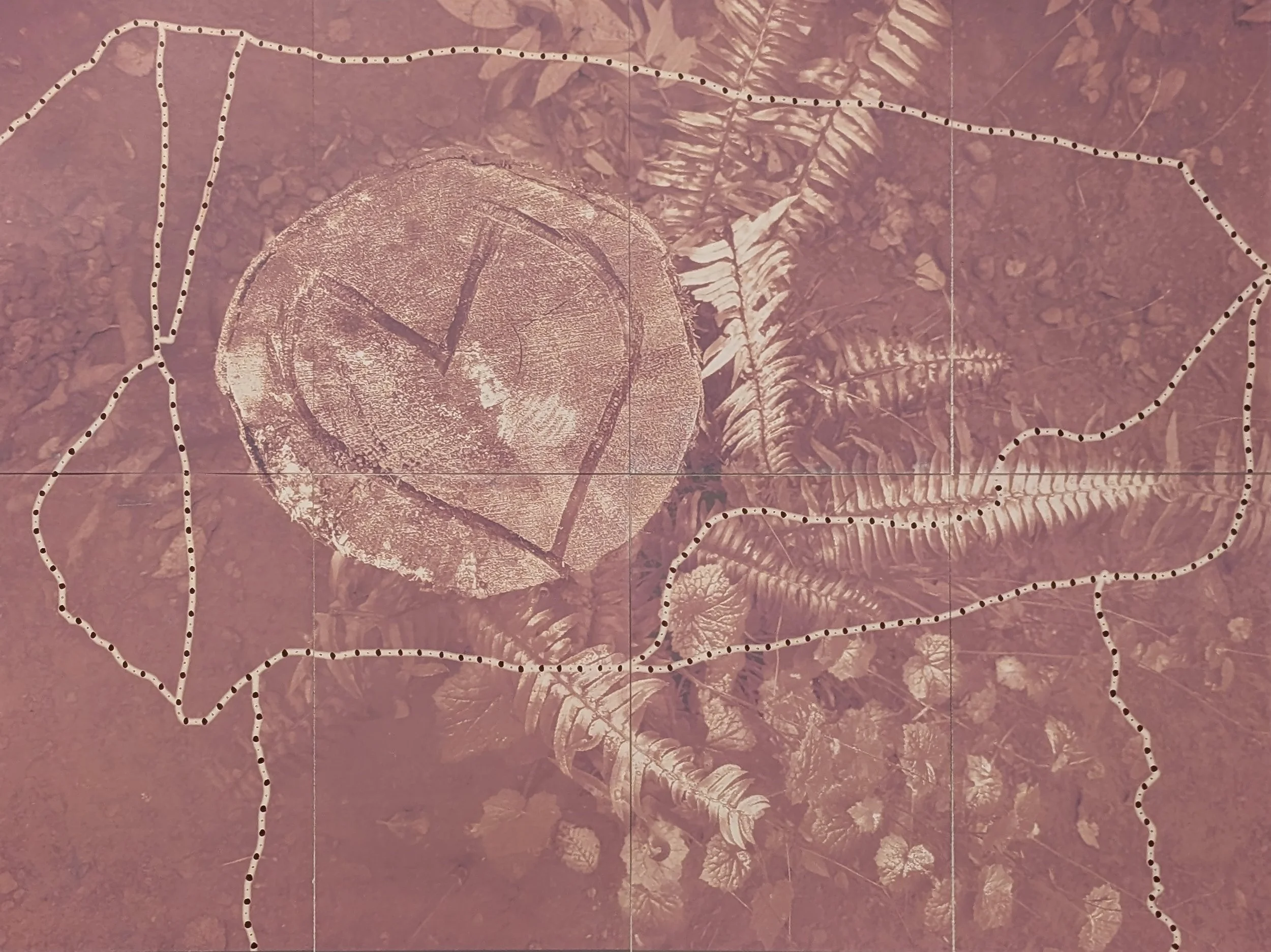 This series of images is a celebration of our local trails and natural spaces and the work that goes into taking care of them. The images are lumen prints created by placing a “negative” of a digital image on expired silver gelatin paper and exposing it to UV light (to mimic the outdoors). Trail maps and other icons are layered on to the prints by hand, using ink and linocut stamps.